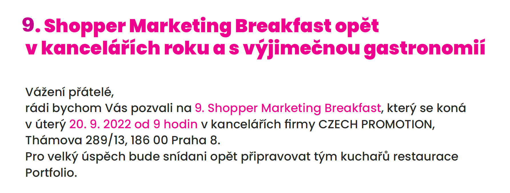rádi bychom Vás pozvali na 9. Shopper Marketing Breakfast, který se koná v úterý 20. 9. 2022 od 9 hodin v kancelářích firmy CZECH PROMOTION, Thámova 289/13, 186 00 Praha 8.