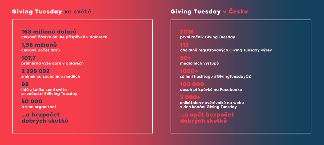 Na Giving Tuesday po celém světě padají filantropické rekordy v částkách vybraných na charitu. Největší svátek dárcovství se ve světě slaví od roku 2012, v Česku teprve podruhé. V loňském roce se do hnutí zapojilo více než 100 zemí světa a na dobrou věc se vybralo 168 milionů dolarů.