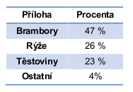 Češi jsou bramborovým národem. V oblíbenosti příloh jsou oblíbenější než rýže (26 procent) či těstoviny (23 procent). K hlavnímu jídlu si brambory nejraději dopřeje skoro polovina Čechů (47 procent). Naopak netradiční přílohy, mezi které se řadí kuskus, bulgur či quinoa, zůstávají v českých domácnostech v pozadí a tvoří 4 procenta.