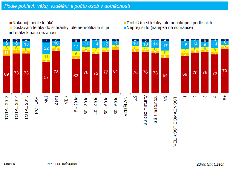 Podle letáků s akčními nabídkami potravin, které dostanou do schránky od obchodních řetězců, nakupuje 7 z 10 domácností. Řídí se jimi více ženy (78 %) než muži (57 %). Překvapivě neexistují velké rozdíly mezi jednotlivými věkovými kategoriemi (72 % lidé ve středním věku, 81 % důchodci) a mezi úrovní dosaženého vzdělání (ZŠ a SŠ bez maturity