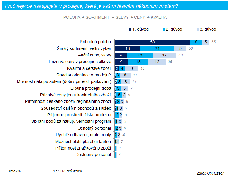 Pouze pro 13 % procent českých domácností jsou hlavním místem pro nákupy menší prodejny, které nelze zařadit mezi hypermarkety, supermarkety nebo diskonty. Obliba řetězců u spotřebitelů meziročně vzrostla o tři procenta. Hlavními důvody, proč v nich nakupuje téměř 9 z 10 domácností České republiky, jsou příhodná poloha, široký sortiment a akční ceny či slevy. Lidé oceňují také kvalitní a čerstvé zboží, snadnou orientaci v prodejně a možnost dobrého parkování.
