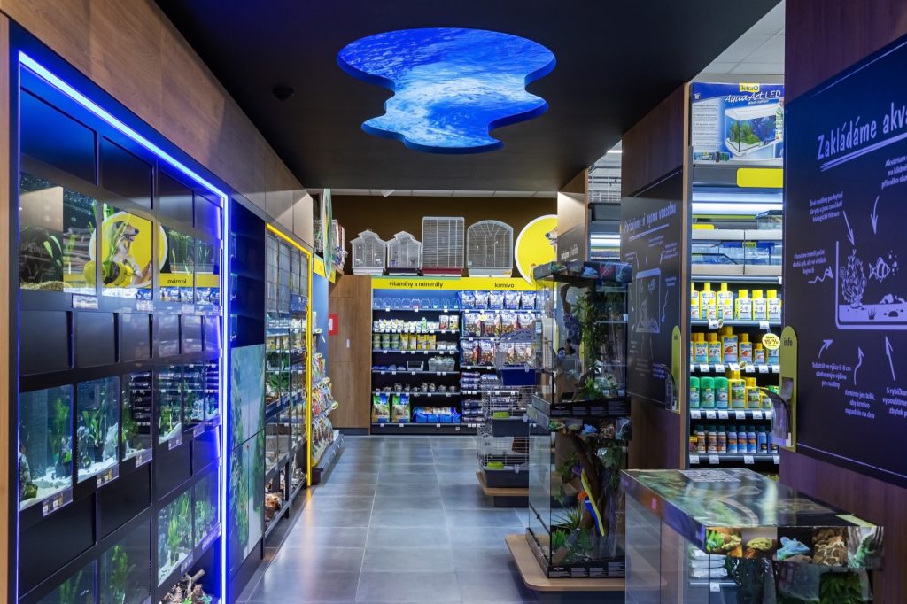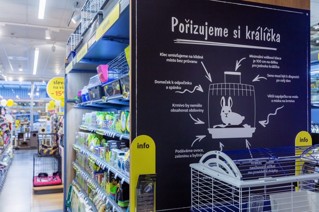 Nákup a zákaznická cesta je protkána edukačními grafikami k jednotlivému sortimentu zboží. „Nezapomeňte jim udělat radost a kupte jim něco na zub“, hlásá cedule v části pamlsky pro psy. Takových emočních grafik je v obchodě mnoho.