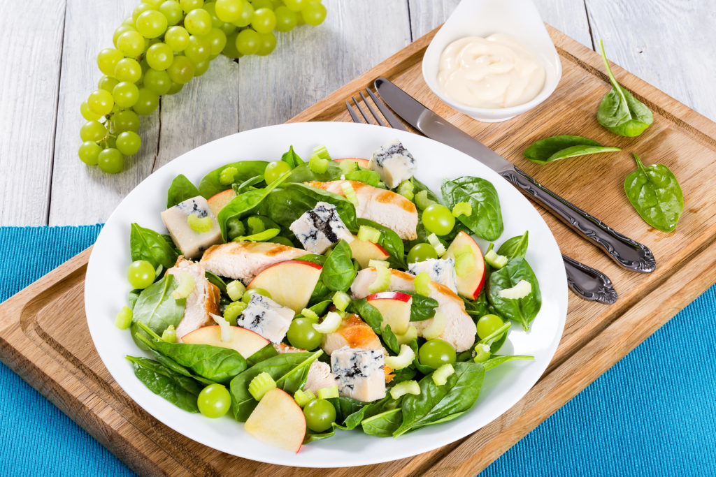 Salát s hrozny, špenátem, nivou a grilovaným kuřecím