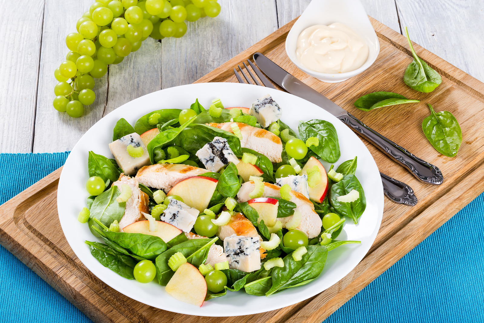 Zeleninu a ovoce pečlivě omyjeme. Jablko a řapíkatý celer nakrájíme na jemné plátky. Přidáme hroznové víno a listový špenát. Vše jemně promícháme. Přidáme špetku soli a pepře a na špičku lžičky trochu cukru. Zalijeme bílým vínem, zakápneme olivovým olejem a znovu promícháme. Nakonec přidáme naporcovanou nivu a grilovaná kuřecí prsa. Dle chuti můžeme ještě přidat pár kapek šťávy z citronu.