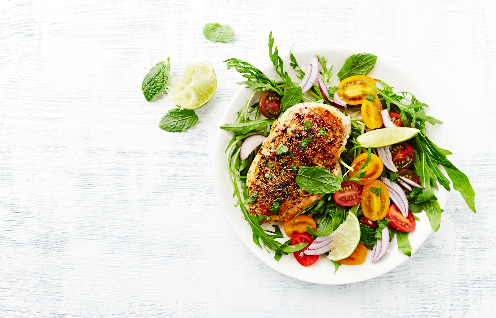 Zeleninu pečlivě omyjeme a rukolu propereme. K rukole přidáme na půlky pokrájená cherry rajčata. Červenou cibuli nakrájíme na jemné plátky a posypeme jimi salát. Ochutíme dle potřeby solí a pepřem a zakápneme olivovým olejem. Grilované kuřecí maso položíme na salát a ozdobíme několika lístky čerstvé máty. Přidat můžeme pár plátků nakrájené limetky.
