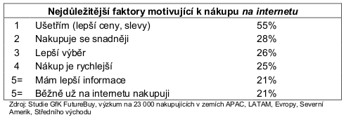 K nejdůležitějším faktorům, které podle slov spotřebitelů rozhodly o tom, že raději nakoupí na internetu a nikoli v obchodě, patří: úspora peněz (tento faktor je s 55 procenty jasně na prvním místě), snadný nákup (28 procent), lepší výběr zboží (26 procent) a rychlejší nákup (25 procent). Jako pátý nejvýznamnější faktor uváděl jeden z pěti nakupujících (21 procent) to, že na internetu získá lepší informace a stejně tak jeden z pěti zákazníků řekl, že už na internetu běžně nakupuje.