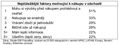 Čtyři z uvedených faktorů ovlivňujících rozhodnutí nakupovat na internetu se však objevují i mezi pěti důvody, jež vedou k rozhodnutí nakupovat v obchodě.