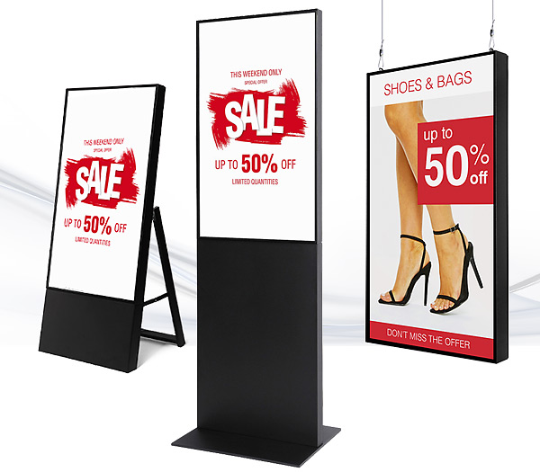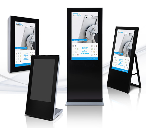 Potřebují zákazníci umístit digitální reklamní poutač vč. profesionálního monitoru do své prodejny, připevnit do výkladu nebo zavěsit na stěnu? Jansen Display má pro ně širokou nabídku poutačů, které stačí jen zapojit do zásuvky! Mezi nejprodávanější patří digitální áčka nebo digitální totemy. Nadstandardním řešením je venkovní totem, který splní nejnáročnější požadavky na provoz i odolnost proti vnějším vlivům a poškození.