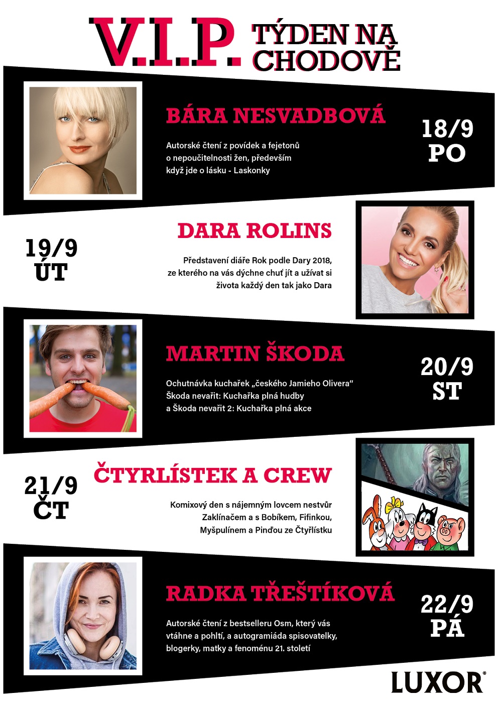Po rozsáhlé rekonstrukci se v polovině září znovuotevírá pobočka knihkupectví Luxor v pražském Centru Chodov. Otevření bude opravdu velkolepé – od 18. do 24. 9. se zde koná V. I. P. týden s každodenním programem za účasti známých osobností. Autorské čtení a autogramiády svých knih budou mít spisovatelky Bára Nesvadbová a Radka Třeštíková. Diář na rok 2018 Rok podle Dary představí zpěvačka Dara Rolins. O gastronomické okénko se postará „český Jamie Oliver“, mladý autor kuchařek Martin Škoda. Pro dětské i dospělé fanoušky komiksu zde bude komiksové odpoledne se Čtyřlístkem a nakladatelstvím CREW. Vstup na všechny akce je zdarma.