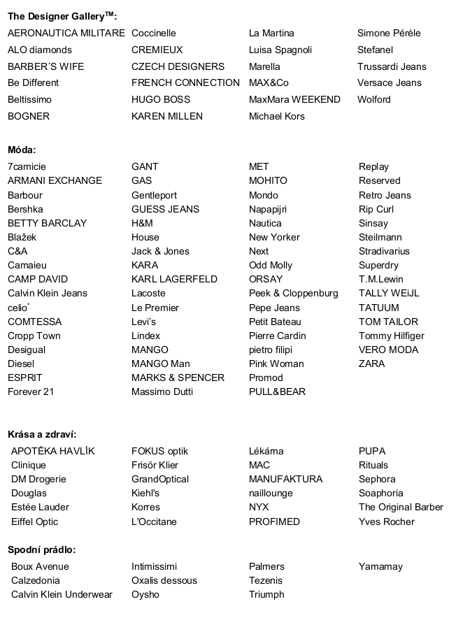 Svůj prostor bude mít v novém centru také vlajková prodejna H&M rozprostírající se na ploše 3 000 m2. Pozadu nezůstane ani síť obchodů Inditex, která zde kromě již zavedených značek Zara, Bershka, Stradivarius, Pull&Bear a Massimo Dutti představí i první tuzemské prodejny Zara Home a OyshoSvůj vstup na český trh zde odstartují také oděvní značky jako je ARMANI EXCHANGE, Pink Woman, Yamamay, Boux Avenue, šperky THOMAS SABO či sportovně laděné AW Lab nebo elektronika DENON.