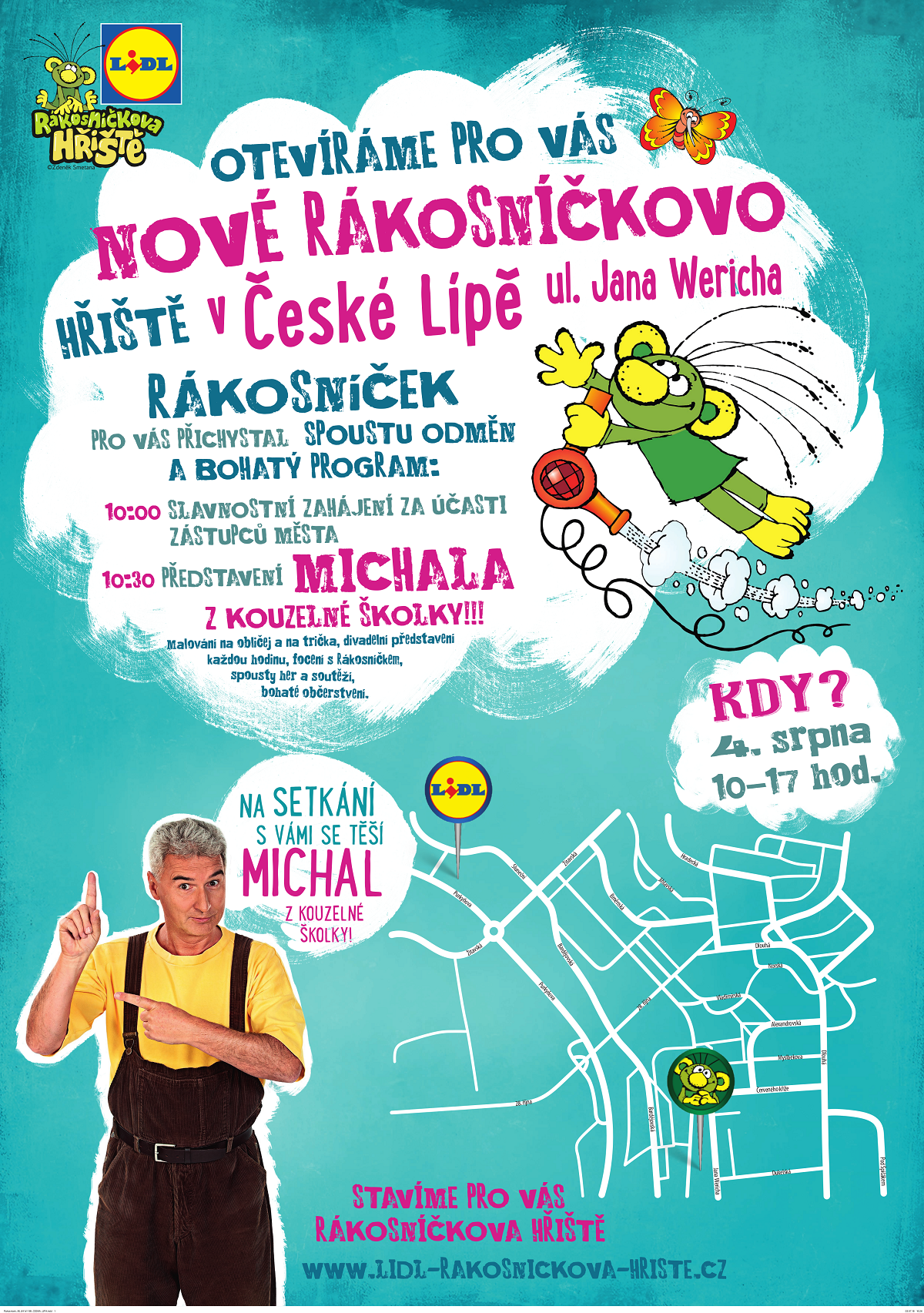 Nemáte ještě plán na tuto sobotu? Zúčastněte se slavnostního otevření Rákosníčkova hřiště v České Lípě, které se koná v ulici Jana Wericha dne 4. srpna od 10:00 do 17:00 hod. Vyrazte s celou svojí rodinou, řekněte také svým přátelům a známým. Půjde o letošní šesté hřiště, které společnost Lidl otevře dětem.