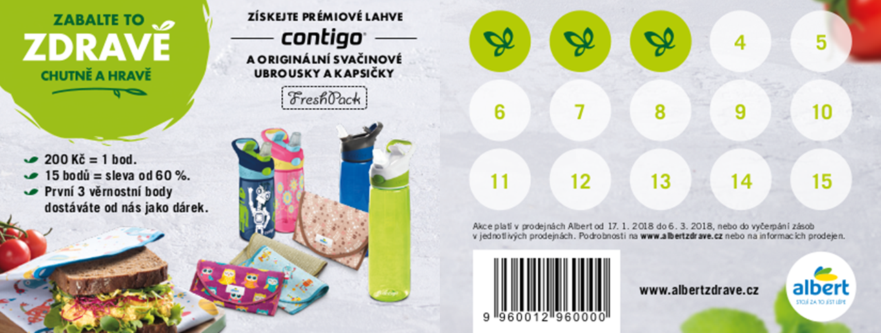 Obchody Albert připravily se startem roku novou věrnostní kampaň. Zákazníci získají za každých 200 korun nákupu nebo za výběr zdravých produktů body, které mohou vyměnit za originální svačinové kapsičky a ubrousky FreshPack či prémiové lahve Contigo s výraznou slevou. Sběratelská kampaň „Zabalte to zdravě, chutně a hravě“ potrvá do 6. března. Albert však bude ke zdravému životnímu stylu v prodejnách inspirovat po celý rok.