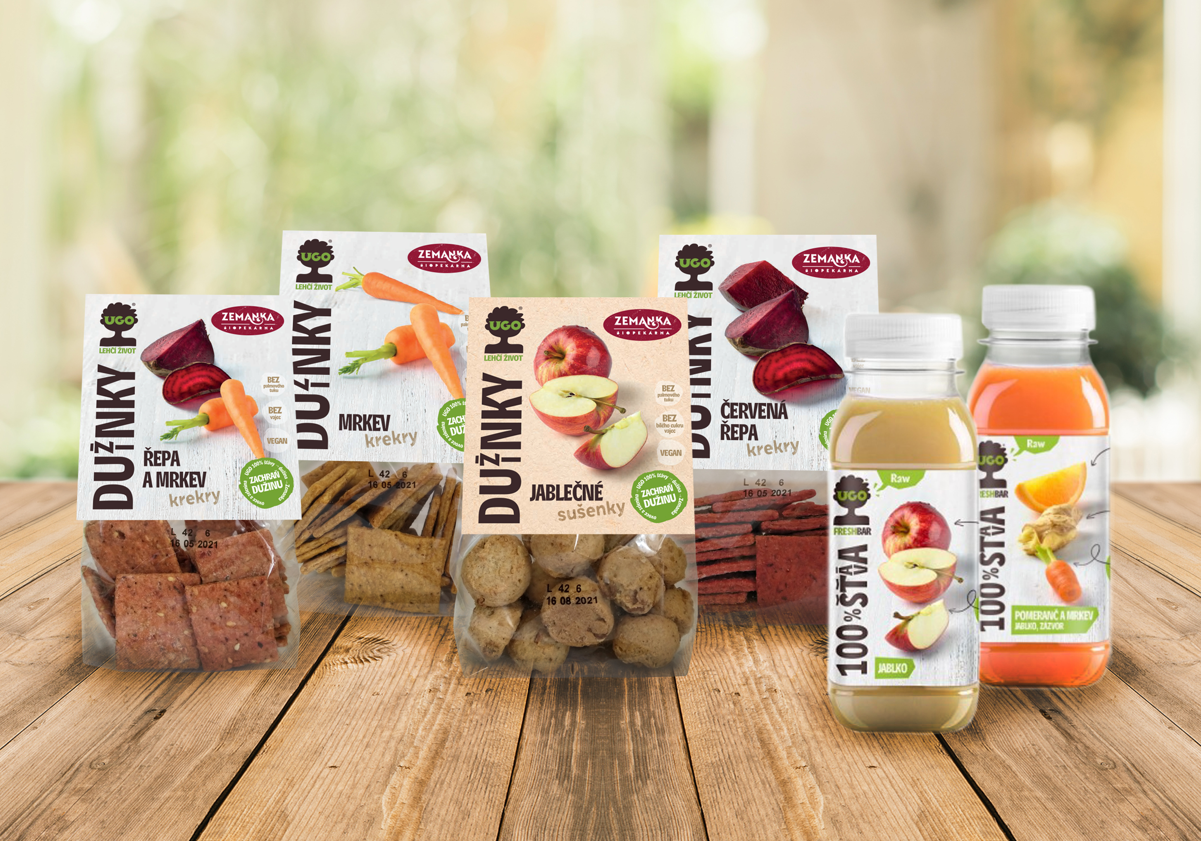 Biopekárna Zemanka a značka UGO představují zcela novou řadu cirkulárních sušenek a krekrů. Jako suroviny využívají lisované ovocné a zeleninové zbytky z výroby paskalizovaných čerstvých šťáv a další ingredience v bio kvalitě. Výsledkem jsou slané i sladké veganské Dužinky. Řada představuje čtyři nové produkty – řepné, mrkvové, řepno-mrkvové krekry a jablečné sušenky, díky nimž se měsíčně zpracuje na 180 kg kvalitních zbytkových surovin, které by jinak končily v odpadu.