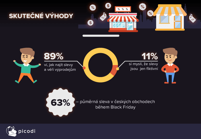 I když se šíří znepokojivé zprávy o falešných slevách, většina spotřebitelů si s tím neláme hlavu. Až 89% dotázaných tvrdí, že umí najít skutečné slevy v široké nabídce černopátkových výprodejů a jen 11% respondentů uvádí, že slevy jsou fiktivní a nezaslouží si naší pozornost. V této souvislosti stačí poznamenat, že podle statistik z minulého roku průměrná výše skutečných slev v českých eshopech dosáhla 63%.