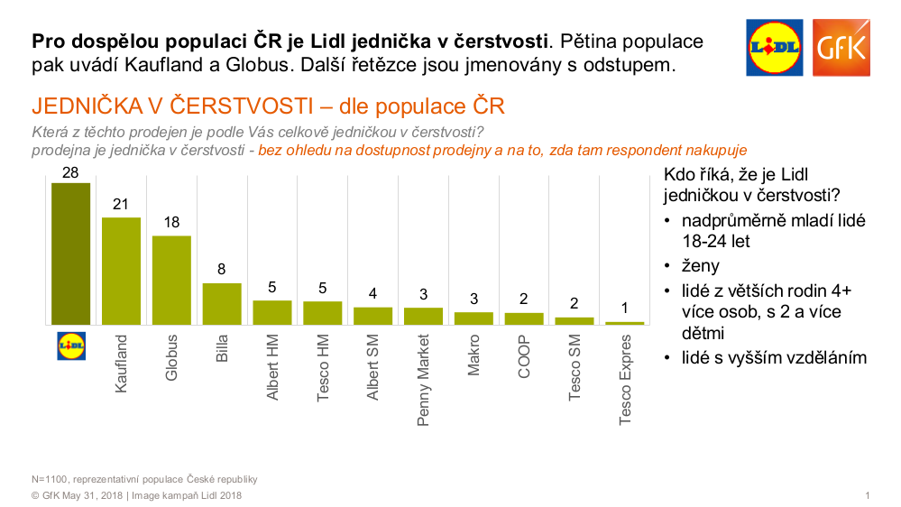 Reprezentativní průzkum „Vnímání kvality a čerstvosti“ realizovaný společností GfK Czech exkluzivně pro společnost Lidl proběhl prostřednictvím online dotazování na vzorku 1 100 respondentů starších 18 let v únoru 2018. Kromě kritérií, podle kterých zákazníci čerstvost posuzují, průzkum také zjišťoval, jak spotřebitelé hodnotí jednotlivé řetězce. Jako jednička v čerstvosti je na českém trhu zákazníky hodnocena společnost Lidl. Ta zvítězila v celkovém souhrnu všech kategorií.