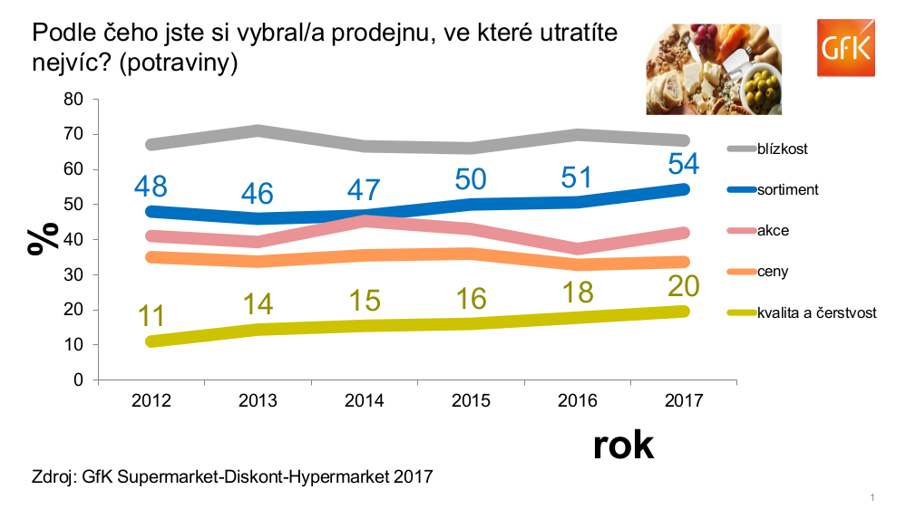 „Zlepšující se ekonomická situace a rostoucí důvěra spotřebitelů ovlivňuje i jejich nákupní rozhodnutí. Stále větší význam má kvalita potravin, jejich čerstvost a příjemný a pohodlný nákup. Koncem roku 2017 si už 20 % zákazníků vybíralo prodejnu podle kvality výrobku – dvakrát víc než o pět let dříve,“ shrnuje změny ve spotřebitelském chování Zdenek Skála, GfK Retail Director CZ.