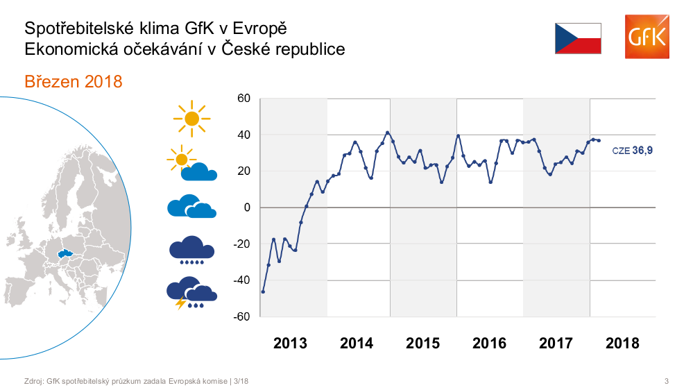 Ukazuje se, že nálada evropských spotřebitelů byla v prvním čtvrtletí 2018 zřetelně méně optimistická než koncem loňského roku. Země, které v roce 2017 vykázaly významný nárůst bodů, je naopak ztratily. Ve všech zemích EU se ekonomická očekávání v březnu 2018 snížila v průměru na 15 bodů. To je o dva body níže než v prosinci 2017. Zejména ve Francii a v Rakousku se euforie těsně po volbách přechodně snížila. Spotřebitelé v České republice a v Belgii vidí ekonomický vývoj svých zemí mnohem pozitivněji.