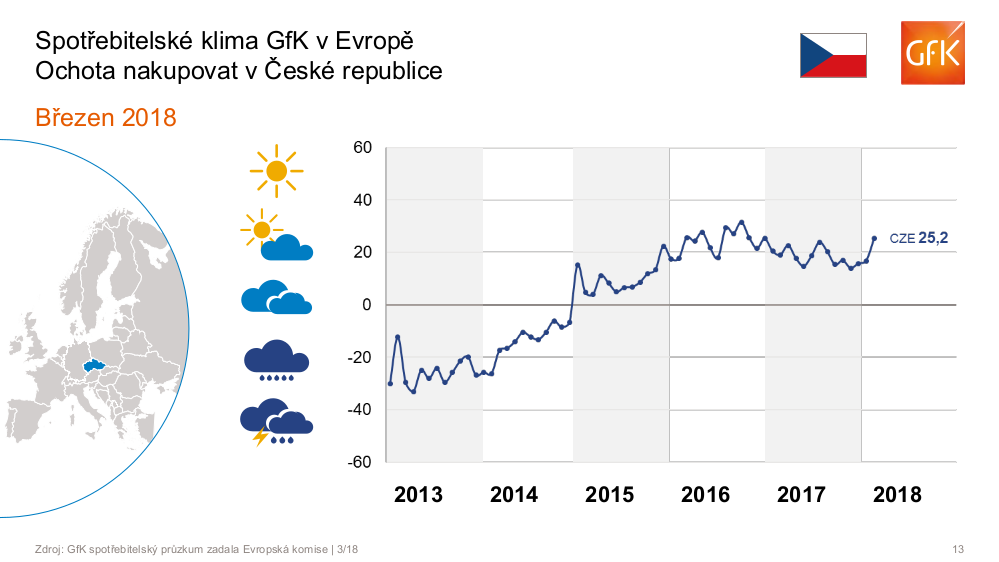 Po určitém poklesu na konci roku se ochota nakupovat u českých spotřebitelů v prvním kvartálu významně zvýšila. V březnu 2018 dosáhl indikátor 25,2 bodu, což představuje nárůst o 11,2 bodu. Česká republika tak patří mezi pět evropských zemí s nejvyšší ochotou nakupovat.