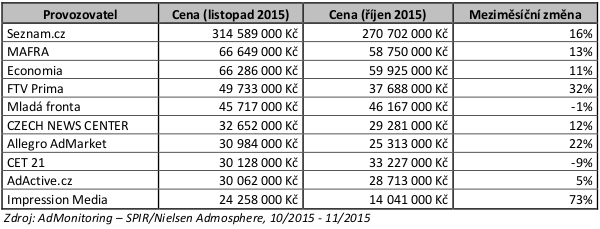 Zadavatelé internetové display reklamy využili v listopadu 2015 inzertní prostor v celkové ceníkové hodnotě 740 milionů korun, což v porovnání s říjnem představuje 13% vzestup. Největším zadavatelem byl internetový obchodník Alza.cz. Údaje vychází z projektu AdMonitoring, který pro Sdružení pro internetový rozvoj zajišťuje společnost Nielsen Admosphere, realizátor českého peoplemetrového projektu.