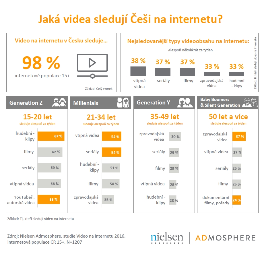 Video na internetu sleduje alespoň někdy 98 % aktivní internetové populace ČR starší 15 let. Obliba video obsahu sledovaného online se však podstatně liší v závislosti na věku konzumenta.
