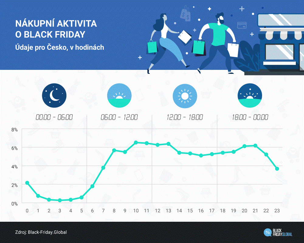 I když vrchol nákupní horečky se může v jednotlivých státech mírně lišit, nejvíce online nákupů je zpravidla ráno a večer. Podle údajů portálu Black-Friday.Global za rok 2018 český zákazník nakupuje nejraději ráno od 10 do 13. hodin a pak večer mezi 20. a 21. hodinou.
