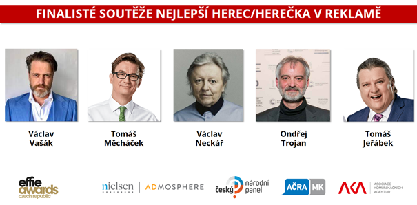 V rámci soutěže Effie Awards, která se pravidelně pořádá po celém světě, se u nás každoročně vyhlašují ty nejlepší počiny v reklamě podle doložených výsledků. Její zajímavou součástí je letos také sekce Nejoblíbenější herec a herečka v reklamě, která se vyhlašuje na základě robustního reprezentativního online výzkumu realizovaného agenturou Nielsen Admosphere a Českým národním panelem. V letošním ročníku soutěže hodnotili respondenti herce a herečky v jejich premiérových reklamách vysílaných v období září 2020 – srpen 2021. A kdo si nakonec převezme cenu pro vítěze? Nebudeme předbíhat, vše se dozvíme na galavečeru Effie, ale můžeme prozradit, že to bude někdo z pětice finalistů: Václav Vašák, Tomáš Měcháček, Václav Neckář, Ivan Trojan nebo Tomáš Jeřábek.