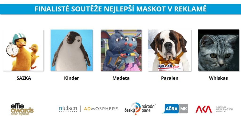 Nejsou to ale jen herci, kdo výrazným způsobem reprezentuje značky a firmy v mediálním prostoru. Zapomínat nemůžeme ani na maskoty, kteří budou mít tento rok v rámci Effie Awards také svoji kategorii. Finalisty za období září 2020 – srpen 2021 jsou postavičky z reklam firem Sazka, Kinder, Madeta, Paralen a Whiskas. Takových reklam bylo v této době k vidění 202, maskotů se v televizních