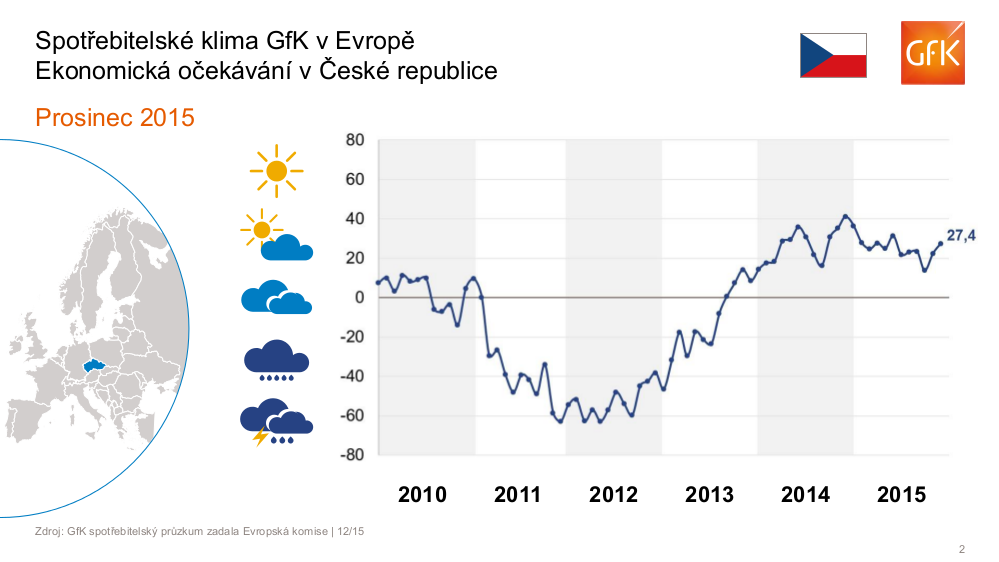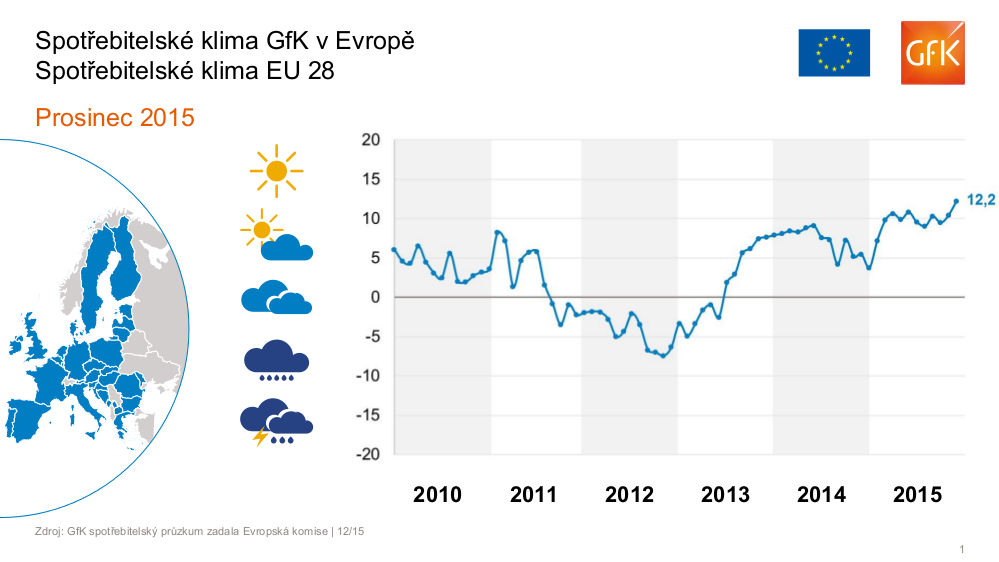 Podle průzkumu GfK Consumer Climate Europe se ve čtvrtém čtvrtletí 2015 pozornost spotřebitelů soustředila na zlepšující se ekonomické výsledky téměř ve všech evropských zemích, jakož i na přetrvávající velmi nízké ceny energií. Od září do prosince 2015 se ukazatel spotřebitelského klimatu v Evropské unii zvýšil o 1,9 bodu na 12,2 bodu.