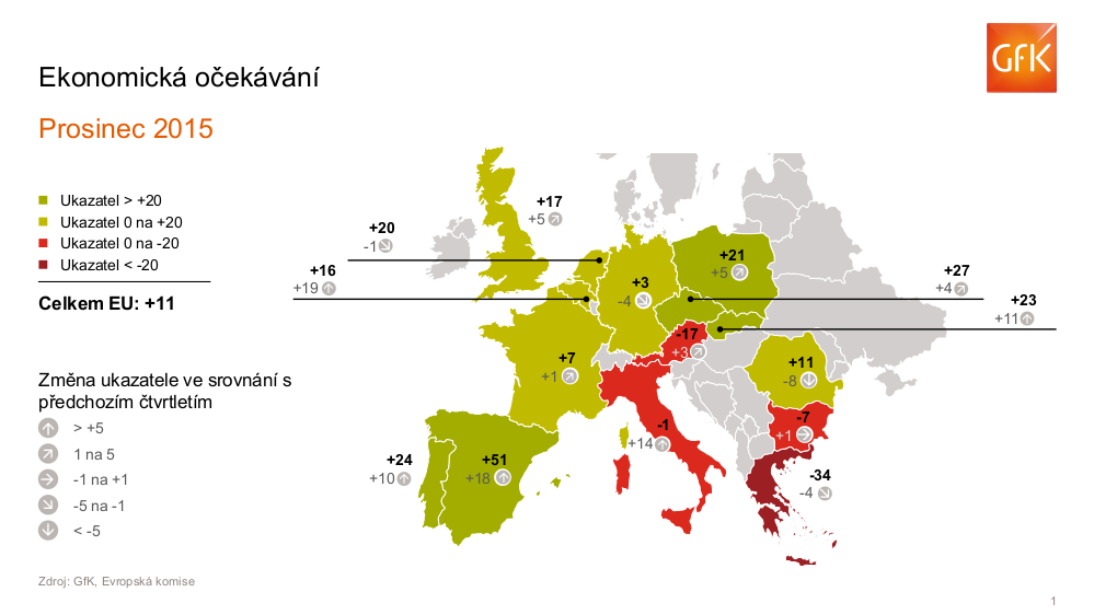 Na podzim se ekonomická očekávání Němců ještě zhoršila. V listopadu ukazatel poklesl o 5,3 bodu a klesl na nejnižší úroveň od února 2013. Přestože se koncem čtvrtletí do určité míry stabilizoval, ve srovnání se třetím čtvrtletím (2,9 bodu) došlo k jeho poklesu o 3,5 bodu. Skutečná ekonomická situace však byla výrazně lepší než nálada mezi německými spotřebiteli. Ve čtvrtém čtvrtletí vzrostl hrubý domácí produkt ve srovnání se stejným obdobím předchozího roku o 1,8 procenta a celkově německá ekonomika v roce 2015 posílila o 1,7 procenta, což je nejrychlejší tempo růstu za čtyři roky. Proto musíme předpokládat, že se ekonomická očekávání německých spotřebitelů znovu začnou zvyšovat.