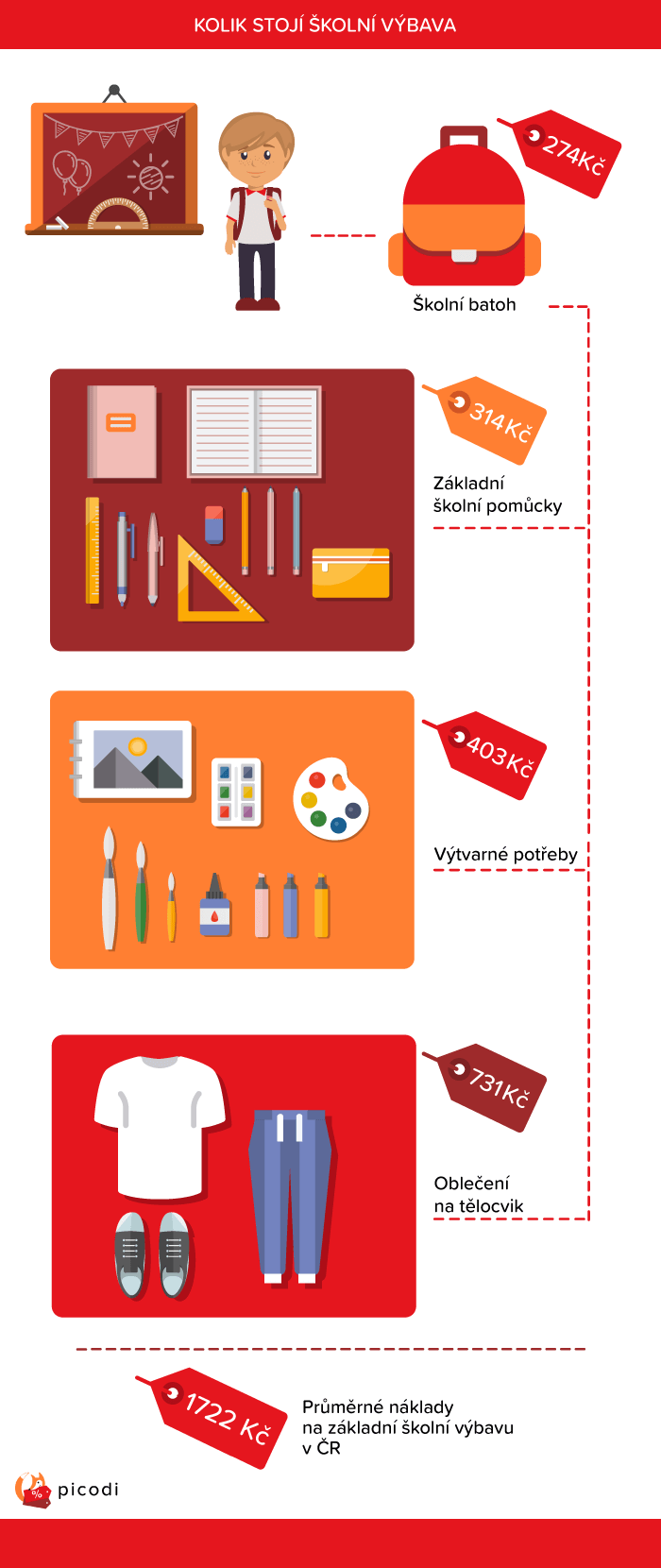 K nejdražším položkám, za které musejí rodiče školou povinných dětí platit, patří dle výzkumu základní výbava na tělocvik. Co bude dítě v první třídě potřebovat? Cvičební úbor a boty do tělocvičny. Z rozboru srpnových slev v internetových obchodech vyplývá, že tyto položky pohltí největší část rodinného rozpočtu. Rodiče si totiž musí připravit částku 731 Kč. Základní vybavení prvňáčka v České republice přijde rodiče celkově na 1722 Kč.