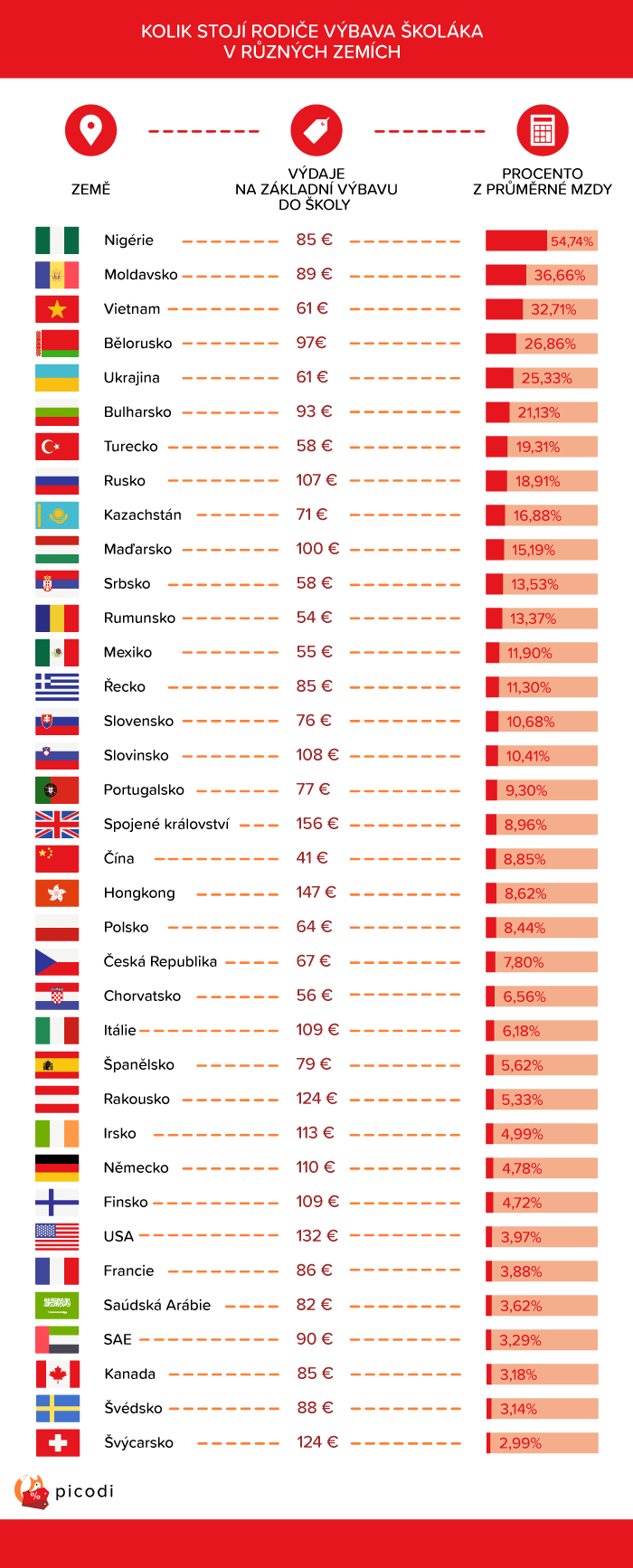 Školní výbava nejvíce zatíží domácí rozpočet v Nigérii a Moldavsku – poslat dítě do školy v těchto státech stojí obrovské peníze (Nigérie – 54,74% a Moldavsko – 36,66% průměrné mzdy). Naopak nejméně na prvňáčky vynakládají ve Švédsku, Kanadě, Francii, Spojených státech amerických, Saudské Arábii a Spojených arabských emirátech. Ukazatel zde nepřekračuje 4%.