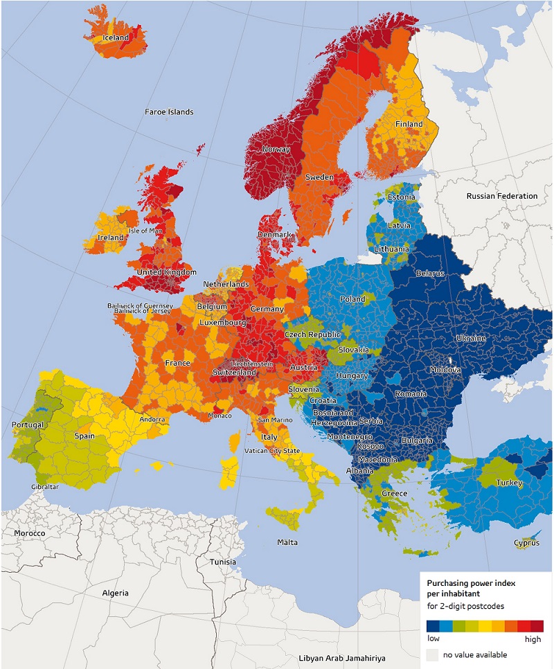 Studie kupní síly GfK Purchasing Power, vyjadřuje nominální disponibilní příjmy populace v eurech. Jsou k dispozici podrobná data až na úrovni jednotlivých správních a poštovních obvodů. V případě zemí, které neplatí eurem, vychází směnný kurz z prognóz Evropské komise zveřejněných 5. května 2015.