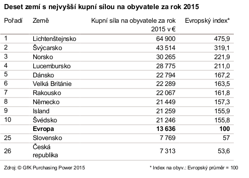 V letošním roce vzrostla v Evropě kupní síla přibližně o čtyři procenta. Výše disponibilních příjmů se však výrazně liší napříč kontinentem i v rámci jednotlivých 42 zemí, které byly do studie společnosti GfK (GfK Purchasing Power Europe) zahrnuty. Zeměpisná poloha je tak jedním z hlavních určujících faktorů kupní síly Evropanů.