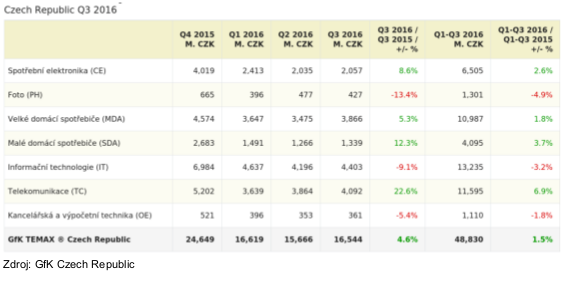 Trh s technickým spotřebním zbožím zaznamenal v České republice za třetí čtvrtletí roku 2016 ve srovnání se stejným obdobím předchozího roku růst na úrovni 4,6 procenta. Čtyři ze sedmi sektorů zaznamenaly pozitivní vývoj. Růst byl tažen zejména telekomunikacemi, které se obratově zvedly meziročně o více než 22 procent. Nejvýrazněji klesl ve třetím kvartálu sektor fota (o 13,4 procenta).