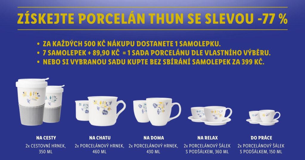 „Věříme, že naší akcí potěšíme všechny, kteří si nejlépe odpočinou právě u své kávy, čaje nebo třeba svařeného vína. Jedná se přitom o exkluzivní nabídku, jelikož hrnky a šálky byly navržené speciálně pro Lidl. A co víc, porcelánová sada může posloužit i jako praktický dárek pod vánoční stromek,“ říká mluvčí Lidlu Tomáš Myler. Nálepky je možné sbírat až do 24. prosince, nebo vyprodání zásob. Sady si zájemci mohou pořídit také bez sbírání známek, a to za 399 Kč.