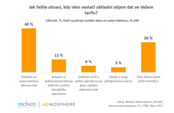 Situaci, kdy základní objem dat v tarifu nestačí, pak respondenti řeší různě. Dvě pětiny například čekají na automatickou obnovu dat v dalším zúčtovacím období. Další z možností je například koupě jednorázového datového balíčku u stávajícího operátora (využívá ji 12 %) nebo změna tarifu na jiný s vyšším objemem mobilních dat (6 %). Možnost dobití předplacené karty nebo odstoupení od smlouvy a změna operátora připadá v úvahu jen pro naprosté minimum dotázaných. Zajímavé však je, že necelá třetina populace ještě tento „problém“ nemusela nikdy řešit.