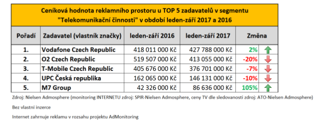 Telekomunikační služby (tedy vedle mobilních operátorů například i poskytovatelé internetového připojení) jsou silným segmentem v oblasti reklamy, o čemž svědčí také žebříček největších inzerentů v období leden–září 2017, který sestavila Nielsen Admosphere v rámci svého monitoringu reklamy Ad Intel. Inzerci v nejvyšší hodnotě v tomto období umístil Vodafone, a to za 428 milionů korun, což je o 2 % více než ve stejném období v loňském roce. Zadavatel O2 využil druhý nejdražší reklamní prostor (v hodnotě 413 milionů korun), ale na rozdíl od Vodafonu jsou jeho letošní čísla o pětinu nižší než loni. Třetím největším inzerentem byl ve zvoleném období T-Mobile, jehož reklama měla ceníkovou hodnotu 377 milionů korun. I tento zadavatel zaznamenal oproti loňsku mírný pokles, a to o 7 %.