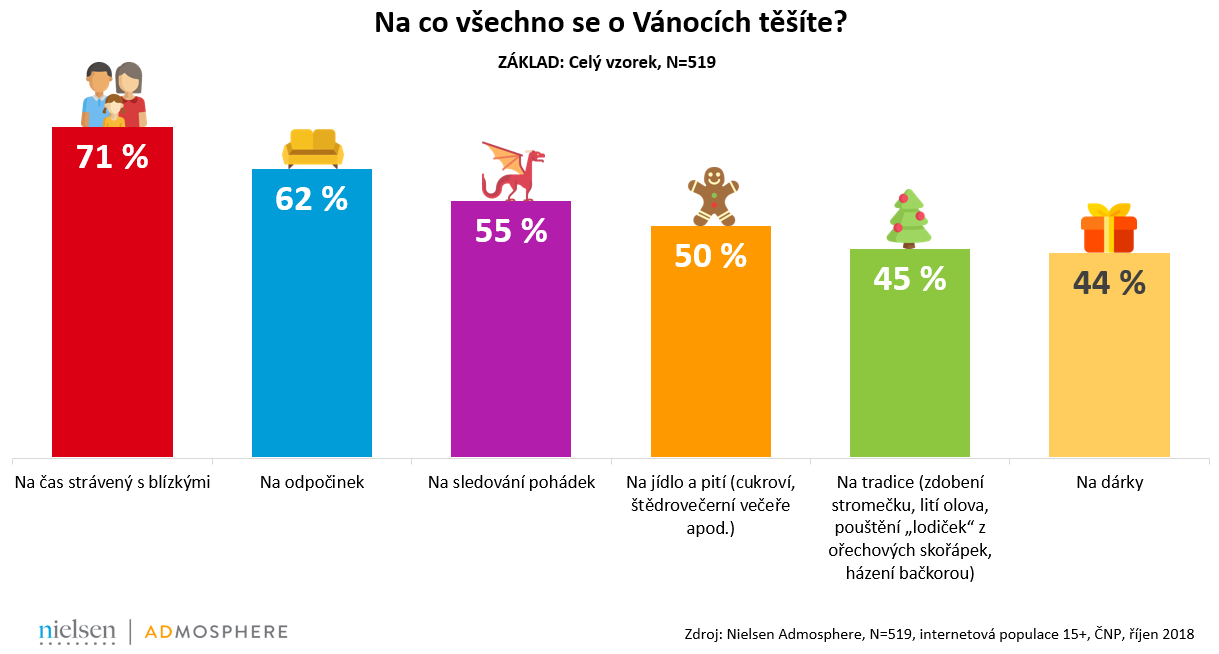 Na čas strávený s nejbližšími se o Vánocích těší skoro tři čtvrtiny dotázaných. Na druhém místě se v žebříčku objevuje odpočinek, který jmenovalo 62 %, a třetí místo patří sledování pohádek, na které se těší více než polovina respondentů. Pohádky o něco více vedou u žen než u mužů a také u respondentů ve věku 15–44 let. Velká část respondentů se ale těší i na jídlo a pití (50 %), na tradice (45 %), jako je zdobení stromečku, lití olova a podobně, a také na dárky (44 %). Jídlo, pití a dárky přitom nepřekvapivě zmiňuje výrazně častěji generace 15–34 let – hned po odpočinku jsou to u nich nejčastější odpovědi.