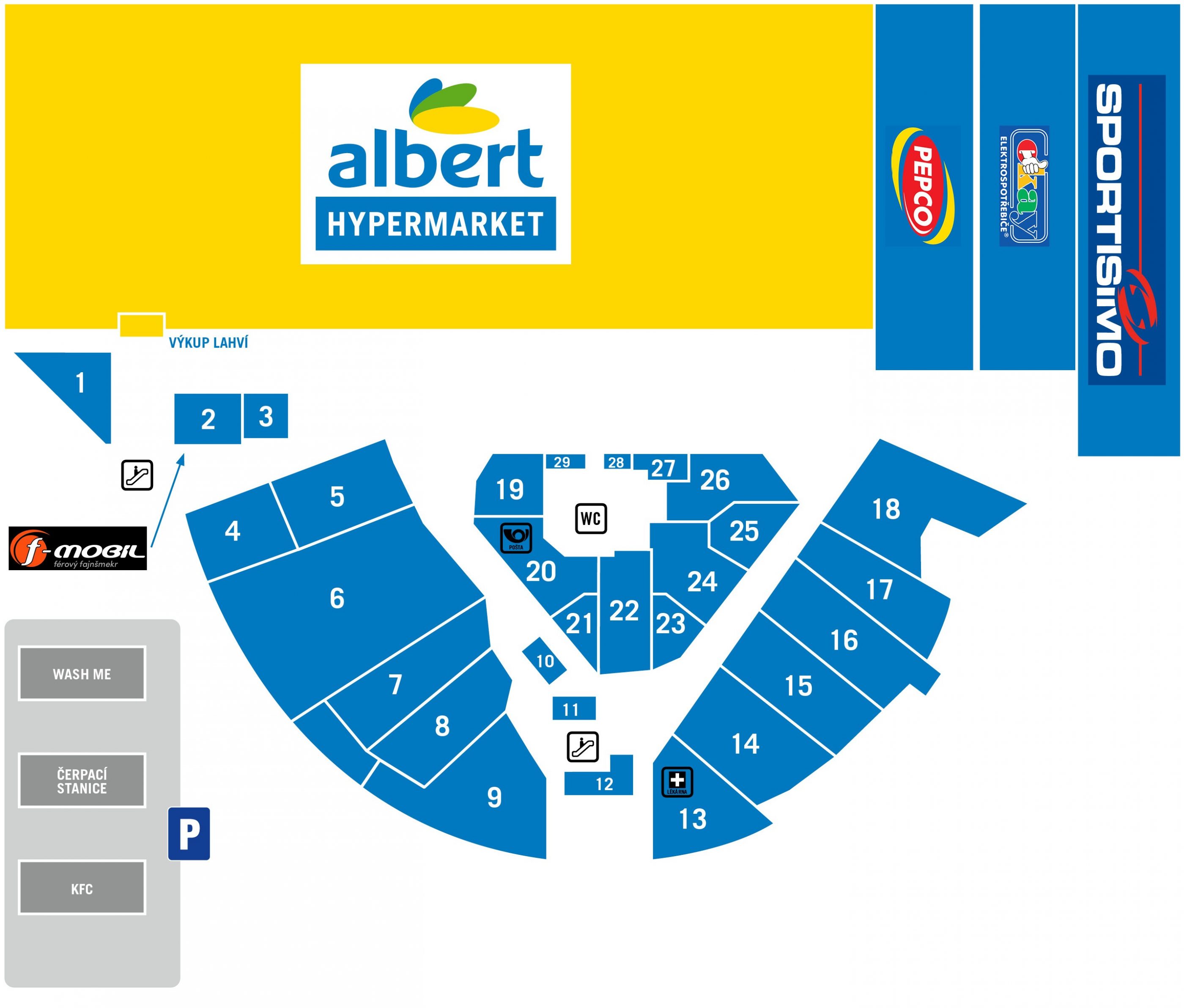 Největší prodejnou v centru je zrekonstruovaný a v roce 2018 znovuotevřený hypermarket Albert, který zde coby nájemce bude působit i nadále. Dalšími klíčovými nájemci jsou např. Sportisimo, Mountfield, Pepco, Teta drogerie, CCC či OKAY Elektro. Ze sektoru food & beverage lze jmenovat řetězec KFC a kavárnu Costa Coffee, do budoucna bude tento sektor významně rozšířen. Bohatá je i nabídka služeb, se značkami jako BENU Lékárna a O2.