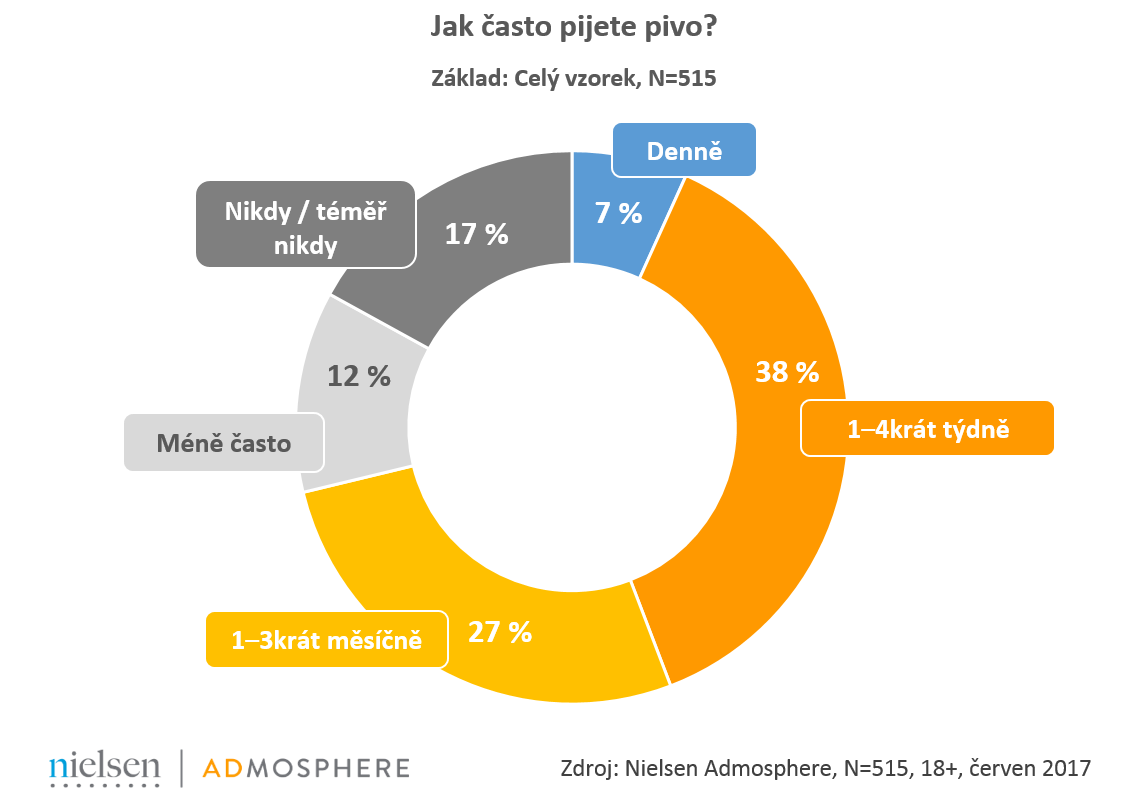 45 % lidí pije pivo alespoň jednou týdně nebo častěji, nejoblíbenější a zároveň nejčastěji konzumované značky jsou Pilsner Urquell a Velkopopovický Kozel. Vychází to z výsledků výzkumu, který realizovala společnost Nielsen Admosphere na vzorku pětistovky respondentů z internetové populace starší 18 let z Českého národního panelu. Nejvyšší nárůst hodnoty reklamy měl ze zadavatelů v segmentu pivo v prvních pěti měsících roku 2017 Gambrinus, jak ukazuje monitoring reklamy Ad Intel.