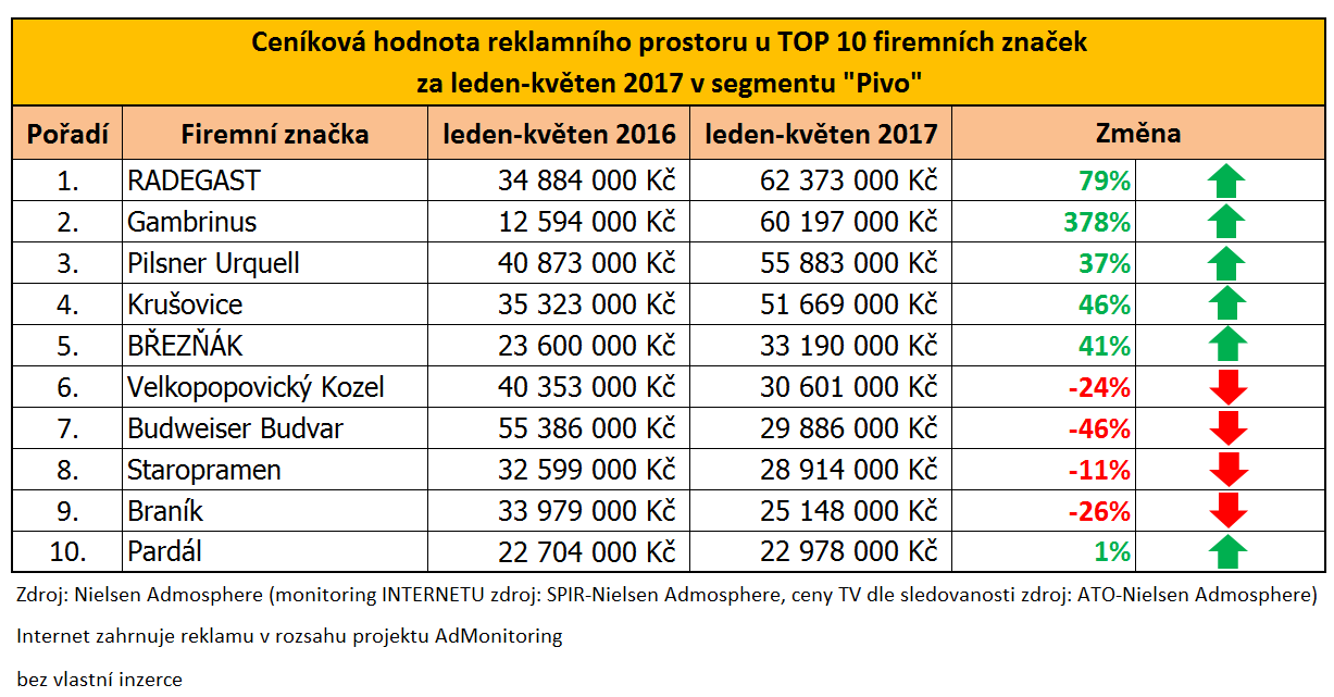 Monitoring reklamy společnosti Nielsen Admosphere pak nabízí pohled na objem inzerce, kterou pivní značky v posledních pěti měsících vystavili. V období leden-květen 2017 umístil reklamu v nejvyšších ceníkových cenách Radegast, a to za 62,4 milionů korun. Ve srovnání se stejným obdobím v roce 2016 je tato hodnota vyšší o 79 %. Největším „skokanem“ prvních pěti měsíců tohoto roku je však Gambrinus: jednak měl v daném období druhou nejvyšší hodnotu reklamy (60,2 milionů korun) a jednak toto číslo představuje téměř pětinásobek jeho loňských hodnot. Reklamu v hodnotě 55,9 milionů korun umístil od začátku roku Pilsner Urquell – je to o 37 % více než loni ve stejné době.