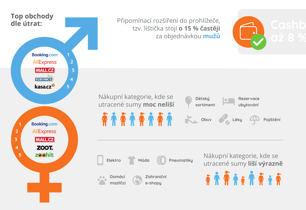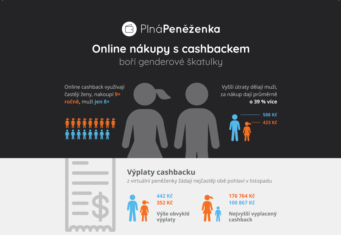 Cashback při svých online nákupech používají muži méně často, ale zato při něm více utratí. V průměru dokonce o 39 % na jeden nákup. Odměnou za nákupy si pak průměrně připíšou 442 korun, ženy jen 352 korun. Výplatu svých naspořených peněz nejčastěji žádají obě pohlaví v listopadu.