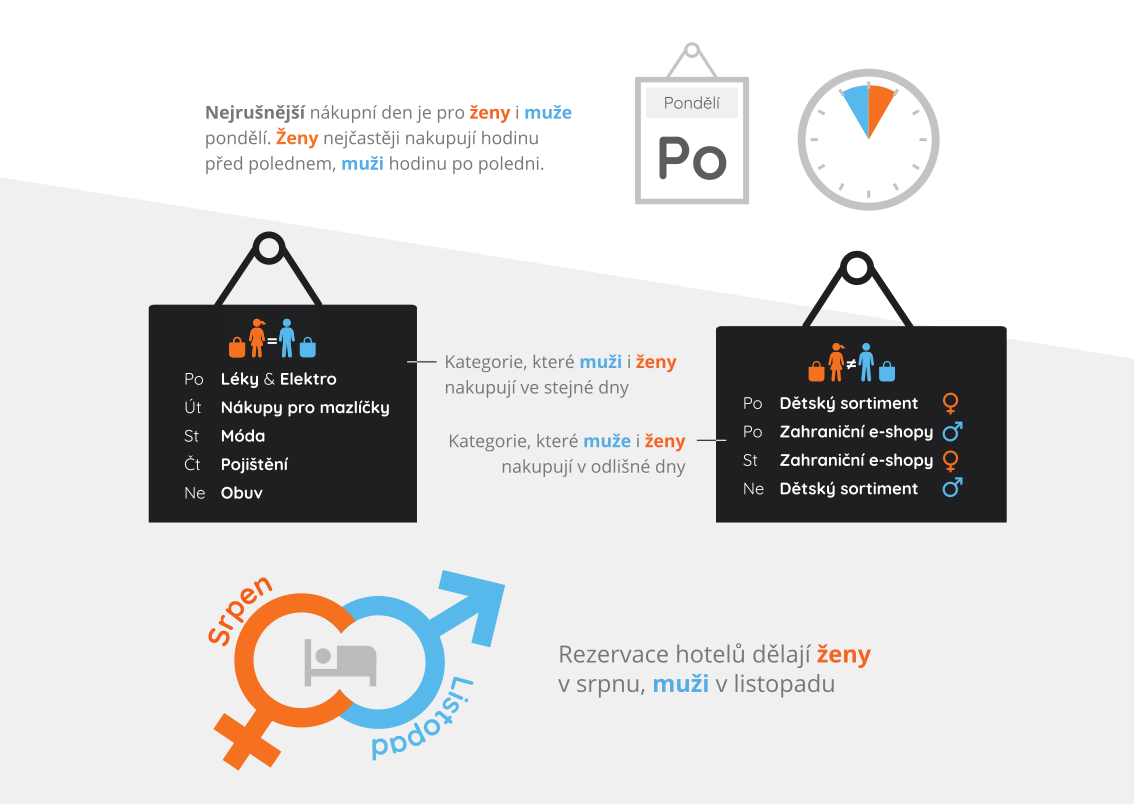 Ženy z Venuše si hotely nejvíce rezervují v srpnu, zato muži z Marsu až v listopadu. Nákup dětského sortimentu je pak doménou Češek, které si ho nechávají na pondělí. Češi pro své ratolesti procházejí e-shopy v neděli. Pokud by to ale byl nákup ze zahraničí, tak by jej muži objednávali v pondělí a ženy v neděli. Pak je tu ale hodně toho, na čem se muži a ženy shodnou. V pondělí si nakoupí elektro a léky, a je to pro ně zároveň i nejrušnější nákupní den. V úterý pak obě pohlaví nakupují pro své domácí mazlíčky, na středu si nechají módu a ve čtvrtek se pojistí.