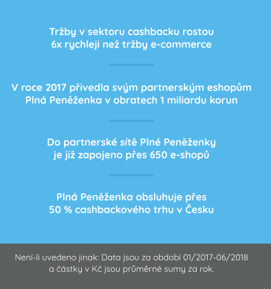 Tržby v sektoru cashbacku rostou celkem 6x rychleji než tržby e-commerce. Lidé nakupují častěji, více a větší sortiment, což se týká mužů i žen. Jen přes Plnou Peněženku mohou nyní nakupovat v 650 e-shopech, kterým v roce 2017 přinesli obrat ve výši 1 miliardy korun. Dnes zaujímá Plná Peněženka přes 50 % cashbackového trhu v České republice.