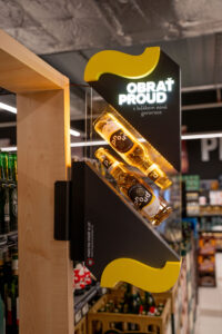 „Při navrhování shelfstopperu, který doplnil kampaň značky Proud, jsme vycházeli z charakteristiky produktu a jeho cílové skupiny. Vzniklo vystavení, ve kterém lahve piva zdánlivě levitují. Odkazují tak jednak na lehkost piva a jednak na zážitek letu ve stavu beztíže, který je hlavní cenou spotřebitelské soutěže,“ vysvětluje Dana Běloušková. „Celkový dojem vystavení je podržen podsvícením v barvě piva, což posouvá nosič do zážitkové roviny a koresponduje s cílovou skupinou.“