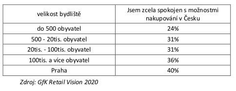 Často se ale předpokládá, že obyvatelé menších obcí vyjíždějí často za zaměstnáním či jinými účely do měst, takže pro ně není problém si tam také nakoupit. Studie GfK Retail Vision 2020 však ukazuje, že jsou dramatické rozdíly ve spokojenosti s nákupy mezi obyvateli měst a vesnic. V Praze a velkých městech jsou zákazníci spokojení, ve vesnicích nespokojení. V Praze deklaruje 40 procent zákazníků, že je „zcela spokojeno s možnostmi nákupu v Česku“; v obcích do 500 obyvatel je spokojeno jen 24 procent zákazníků. Celkově platí, že čím větší obec, tím jsou zde zákazníci spokojenější – přesto, že ve větších městech je zákazník již širokou nabídkou vychovaný k vyšším nárokům.