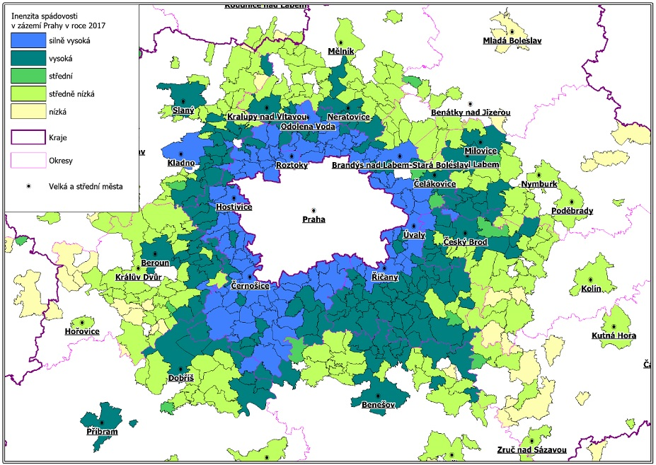 Společnost Česká distribuční zmapovala intenzitu a směr dopravy v okolí měst a obcí v Česku, takzvanou spádovost. Ukázalo se, že se výrazně rozšiřuje zázemí velkoměst a za prací či službami tam každý den dojíždí stále více lidí ze stále větší vzdálenosti. Tento jev má výrazný dopad také na nákupní chování zákazníků a tedy výrazně vstupuje do plánování marketingových kampaní. To platí zejména pro oblast retailu. Z obcí Středočeského kraje, největšího zázemí České republiky, vyjíždí do Prahy téměř 140 000 lidí. Před 15 lety to přitom bylo přibližně 95 000 lidí. To představuje nárůst o více než 47 %. Podobná situace panuje i u ostatních velkých měst. Spolu s tímto trendem potvrdila studie také pokračování „vylidňování“ tradičního venkova.