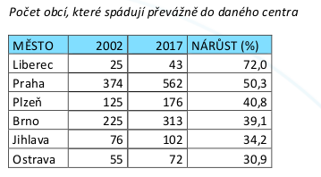Oproti roku 2002 vzrostla výrazně orientace spádovosti na Prahu na úkor menších spádových center. Praha zvětšila své zázemí z 374 obcí na 562 obcí. Jde o obce, u kterých většina jejich dojíždějících obyvatel spáduje na Prahu. Dříve byla Praze v tomto ohledu konkurencí bývalá okresní města Středočeského kraje. Dnes ale význam Prahy vzrostl natolik, že je schopna přilákat mnohem větší počet lidí, a to i z větší vzdálenosti. Praha a její blízké okolí tak ještě zvýšily svůj význam jakožto centrum nákupů zboží a služeb. Tento efekt s menší intenzitou můžeme pozorovat i v ostatních regionech v České republice. Česká distribuční zjistila, že z 6250 obcí v ČR změnilo své převažující dojížďkové centrum (město kam dojíždí nejvíce obyvatel) 1278 obcí, což je více než 20 %.