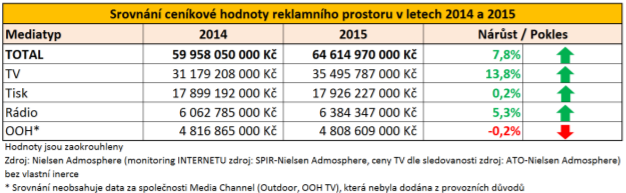 Českému reklamnímu trhu se v loňském roce dařilo. Hlavním tahounem byla televize s inzercí v ceníkové hodnotě přesahující 35 miliard korun, díky čemuž udržela meziročně dvouciferný nárůst (+ 13,8 % v ceníkových cenách). Velký podíl mělo více než 40% navýšení počtu reklamních spotů – v roce 2015 jich byly odvysílány téměř 4 miliony.