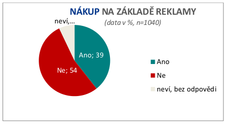 „Nákup na základě reklamy, či přesněji ochota přiznat takový nákup, jsme do výzkumu zařadili již v roce 1994. Po celou dobu šetření se hodnoty odpovědí „ano, koupil/a/ jsem na základě reklamy“ pohybují v průměru mezi 30 – 40 % a v posledních letech se poměry mírně přiblížily a hodnoty jen jemně oscilují. V letošním roce to bylo, jak vidíme z grafu, 39 %.“